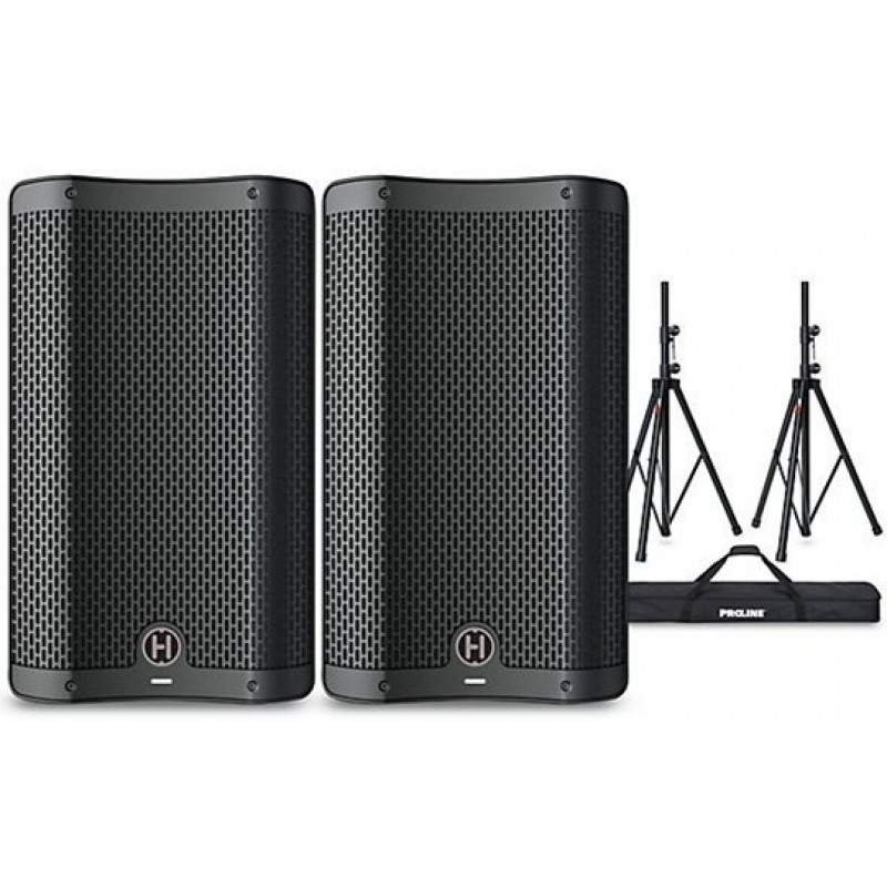 The Harbinger VARI V2410 10" powered speaker package contains two VARI V2410 10" loudspeakers and stands.Harbinger VARI V2410 10" Loudspeaker