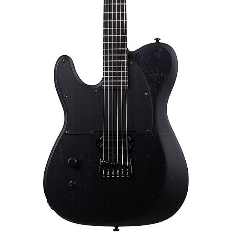 Clad in satin black with matching hardware, the Schecter PT Black Ops lefty electric guitar has menacing good looks to match its crushing sound. The arched mahogany body and beveled edges provide ergonomic contours for playing comfort. Extra jumbo frets sit atop the dark ebony fingerboard, while Schecter's signature inlays mark the fingerboard. Volume and pickup selection controls are conveniently placed above the neck pickup. The black hardware—including Schecter locking tuners and a TonePros bridge—blend seamlessly into the dark design. With its stealthy vibe and smooth curves, the Black Ops turns heads on stage.